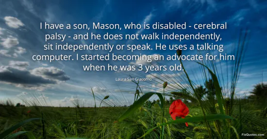 Giacomo, Laura San. "I have a son, Mason, who is disabled - cerebral palsy - and he does not walk independently, sit independently or speak. He uses a talking computer. I started becoming an advocate for him when he was 3 years old." FixQuotes. January 16, 2026. https://fixquotes.com/quotes/i-have-a-son-mason-who-is-disabled-cerebral-133797/.