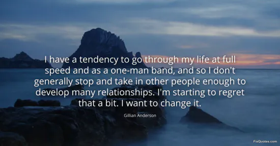 Anderson, Gillian. "I have a tendency to go through my life at full speed and as a one-man band, and so I don't generally stop and take in other people enough to develop many relationships. I'm starting to regret that a bit. I want to change it." FixQuotes. January 17, 2026. https://fixquotes.com/quotes/i-have-a-tendency-to-go-through-my-life-at-full-53490/.