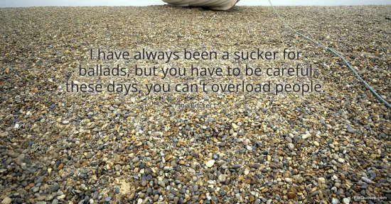 "I have always been a sucker for ballads, but you have to be careful these days, you can't overload people." FixQuotes, 16 Jan. 2026, https://fixquotes.com/quotes/i-have-always-been-a-sucker-for-ballads-but-you-117721/. Accessed 12 Feb. 2026.