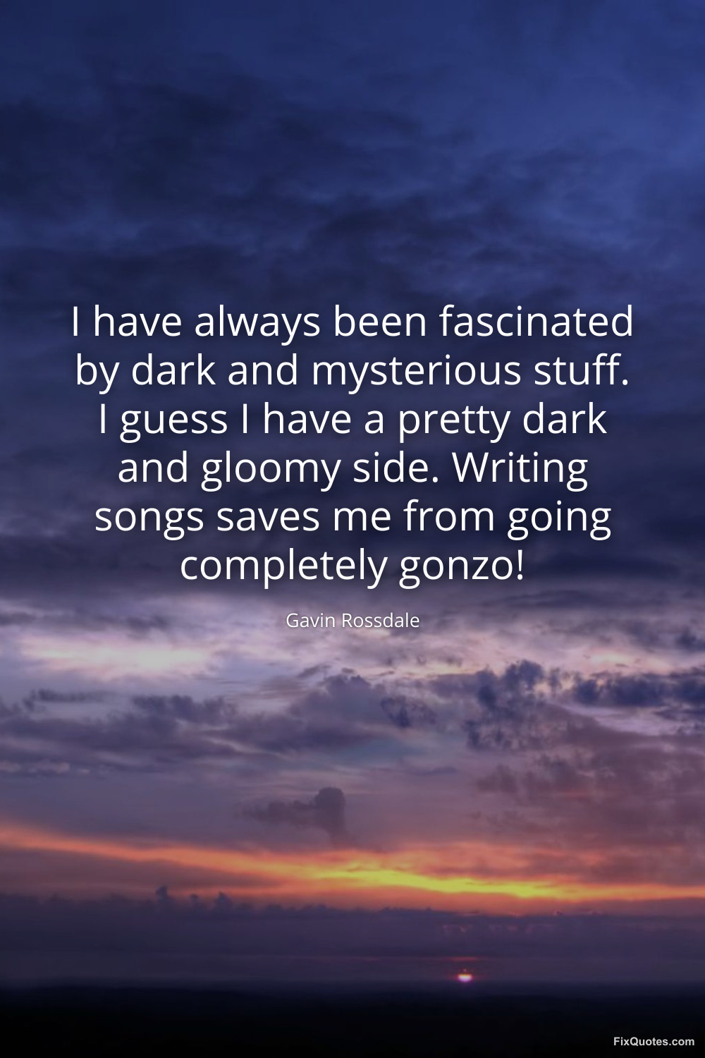 Rossdale, Gavin. "I have always been fascinated by dark and mysterious stuff. I guess I have a pretty dark and gloomy side. Writing songs saves me from going completely gonzo!" FixQuotes. February 19, 2026. https://fixquotes.com/quotes/i-have-always-been-fascinated-by-dark-and-48272/.