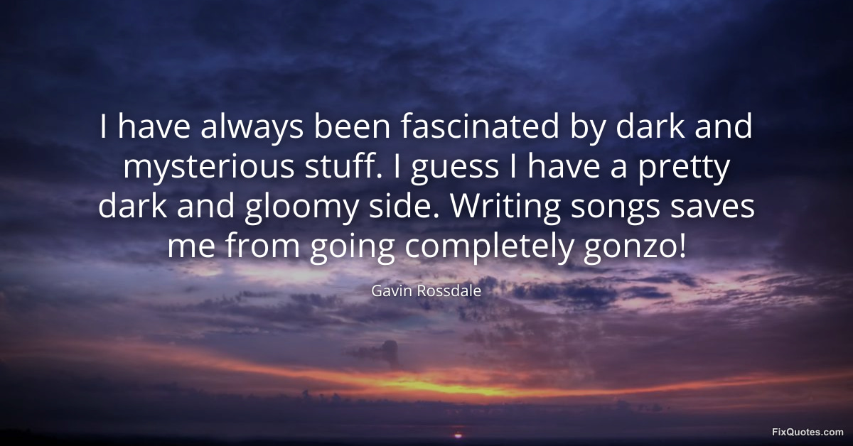 Rossdale, Gavin. (2026, February 19). I have always been fascinated by dark and mysterious stuff. I guess I have a pretty dark and gloomy side. Writing songs saves me from going completely gonzo! FixQuotes. https://fixquotes.com/quotes/i-have-always-been-fascinated-by-dark-and-48272/