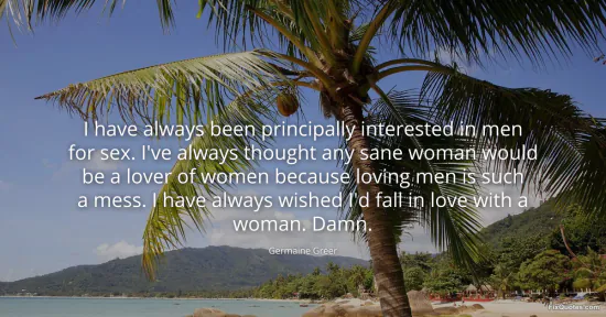 Greer, Germaine. "I have always been principally interested in men for sex. I've always thought any sane woman would be a lover of women because loving men is such a mess. I have always wished I'd fall in love with a woman. Damn." FixQuotes. January 17, 2026. https://fixquotes.com/quotes/i-have-always-been-principally-interested-in-men-54690/.