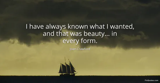 Crawford, Joan. (2026, January 16). I have always known what I wanted, and that was beauty... in every form. FixQuotes. https://fixquotes.com/quotes/i-have-always-known-what-i-wanted-and-that-was-97934/