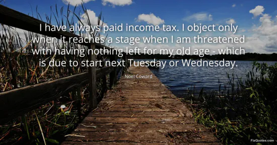 Coward, Noel. (2026, January 16). I have always paid income tax. I object only when it reaches a stage when I am threatened with having nothing left for my old age - which is due to start next Tuesday or Wednesday. FixQuotes. https://fixquotes.com/quotes/i-have-always-paid-income-tax-i-object-only-when-114814/