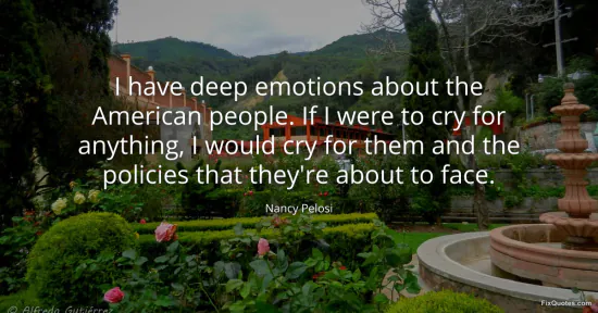 Pelosi, Nancy. "I have deep emotions about the American people. If I were to cry for anything, I would cry for them and the policies that they're about to face." FixQuotes. January 18, 2026. https://fixquotes.com/quotes/i-have-deep-emotions-about-the-american-people-if-963/.