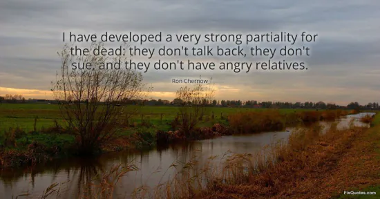 Chernow, Ron. "I have developed a very strong partiality for the dead: they don't talk back, they don't sue, and they don't have angry relatives." FixQuotes. January 15, 2026. https://fixquotes.com/quotes/i-have-developed-a-very-strong-partiality-for-the-87846/.
