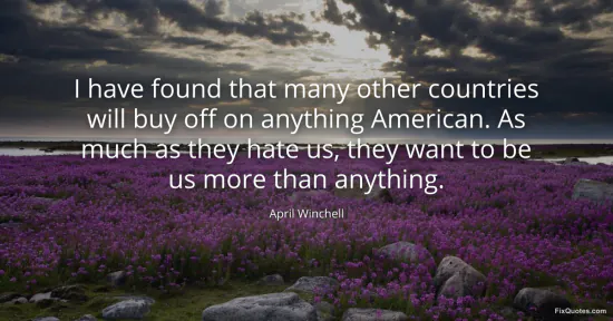 Winchell, April. "I have found that many other countries will buy off on anything American. As much as they hate us, they want to be us more than anything." FixQuotes. January 17, 2026. https://fixquotes.com/quotes/i-have-found-that-many-other-countries-will-buy-35328/.