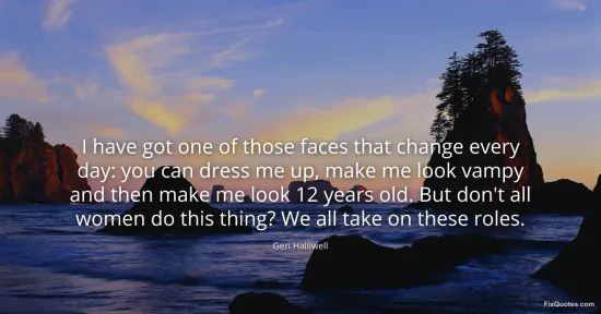Halliwell, Geri. "I have got one of those faces that change every day: you can dress me up, make me look vampy and then make me look 12 years old. But don't all women do this thing? We all take on these roles." FixQuotes. January 15, 2026. https://fixquotes.com/quotes/i-have-got-one-of-those-faces-that-change-every-144046/.