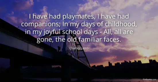 Lamb, Charles. (2026, January 17). I have had playmates, I have had companions; In my days of childhood, in my joyful school days - All, all are gone, the old familiar faces. FixQuotes. https://fixquotes.com/quotes/i-have-had-playmates-i-have-had-companions-in-my-45008/
