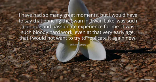Kempe, William. "I have had so many great moments, but I would have to say that dancing the Swan in 'Swan Lake' was such a unique and passionate experience for me. It was such bloody hard work, even at that very early age, that I would not want to try to replicate it again now." FixQuotes. January 16, 2026. https://fixquotes.com/quotes/i-have-had-so-many-great-moments-but-i-would-have-129771/.