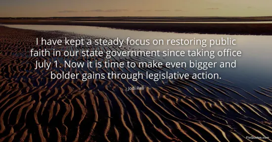 Rell, Jodi. (2026, January 16). I have kept a steady focus on restoring public faith in our state government since taking office July 1. Now it is time to make even bigger and bolder gains through legislative action. FixQuotes. https://fixquotes.com/quotes/i-have-kept-a-steady-focus-on-restoring-public-89844/