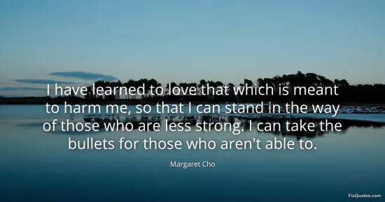 Cho, Margaret. (2026, January 15). I have learned to love that which is meant to harm me, so that I can stand in the way of those who are less strong. I can take the bullets for those who aren't able to. FixQuotes. https://fixquotes.com/quotes/i-have-learned-to-love-that-which-is-meant-to-159135/
