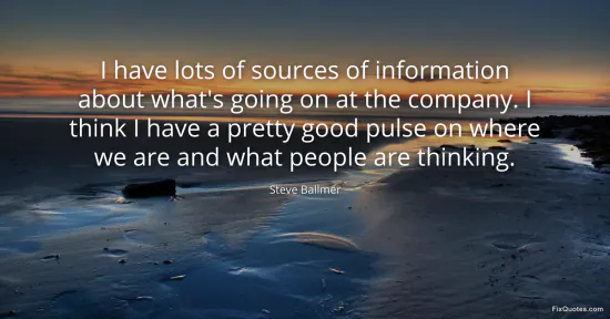 Ballmer, Steve. "I have lots of sources of information about what's going on at the company. I think I have a pretty good pulse on where we are and what people are thinking." FixQuotes. January 15, 2026. https://fixquotes.com/quotes/i-have-lots-of-sources-of-information-about-whats-166700/.