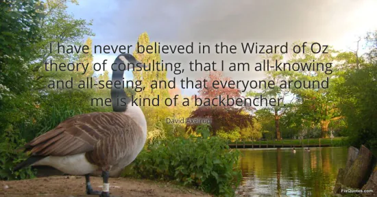 "I have never believed in the Wizard of Oz theory of consulting, that I am all-knowing and all-seeing, and that everyone around me is kind of a backbencher." FixQuotes, 17 Jan. 2026, https://fixquotes.com/quotes/i-have-never-believed-in-the-wizard-of-oz-theory-53627/. Accessed 6 Feb. 2026.