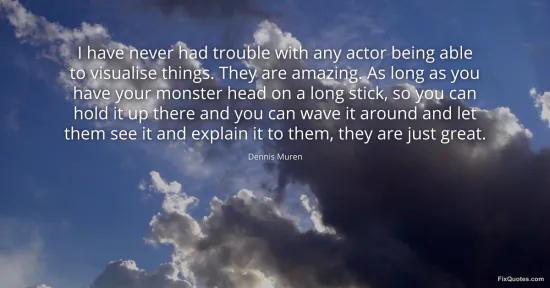 Muren, Dennis. "I have never had trouble with any actor being able to visualise things. They are amazing. As long as you have your monster head on a long stick, so you can hold it up there and you can wave it around and let them see it and explain it to them, they are just great." FixQuotes. January 17, 2026. https://fixquotes.com/quotes/i-have-never-had-trouble-with-any-actor-being-46189/.