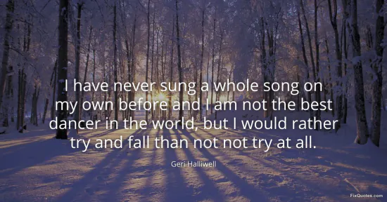 Halliwell, Geri. (2026, January 17). I have never sung a whole song on my own before and I am not the best dancer in the world, but I would rather try and fall than not not try at all. FixQuotes. https://fixquotes.com/quotes/i-have-never-sung-a-whole-song-on-my-own-before-61492/