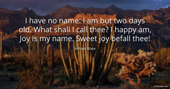 Blake, William. "I have no name: I am but two days old. What shall I call thee? I happy am, Joy is my name. Sweet joy befall thee!" FixQuotes. January 18, 2026. https://fixquotes.com/quotes/i-have-no-name-i-am-but-two-days-old-what-shall-i-16022/.