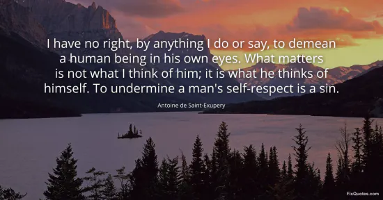 Saint-Exupery, Antoine de. "I have no right, by anything I do or say, to demean a human being in his own eyes. What matters is not what I think of him; it is what he thinks of himself. To undermine a man's self-respect is a sin." FixQuotes. January 17, 2026. https://fixquotes.com/quotes/i-have-no-right-by-anything-i-do-or-say-to-demean-29906/.