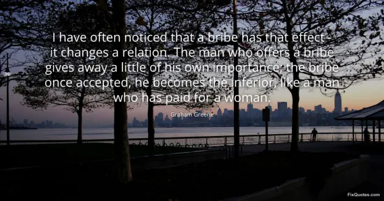 Greene, Graham. "I have often noticed that a bribe has that effect - it changes a relation. The man who offers a bribe gives away a little of his own importance; the bribe once accepted, he becomes the inferior, like a man who has paid for a woman." FixQuotes. January 17, 2026. https://fixquotes.com/quotes/i-have-often-noticed-that-a-bribe-has-that-effect-74512/.