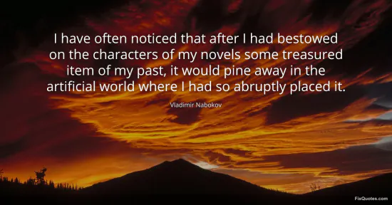Nabokov, Vladimir. "I have often noticed that after I had bestowed on the characters of my novels some treasured item of my past, it would pine away in the artificial world where I had so abruptly placed it." FixQuotes. January 18, 2026. https://fixquotes.com/quotes/i-have-often-noticed-that-after-i-had-bestowed-on-16303/.