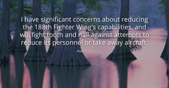 Pryor, Mark. "I have significant concerns about reducing the 188th Fighter Wing's capabilities, and will fight tooth and nail against attempts to reduce its personnel or take away aircraft." FixQuotes. January 17, 2026. https://fixquotes.com/quotes/i-have-significant-concerns-about-reducing-the-70301/.