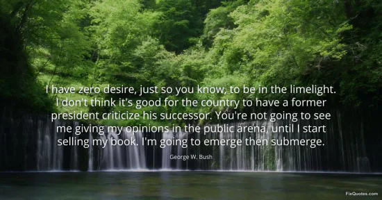 Bush, George W. (2026, January 17). I have zero desire, just so you know, to be in the limelight. I don't think it's good for the country to have a former president criticize his successor. You're not going to see me giving my opinions in the public arena, until I start selling my book. I'm going to emerge then submerge. FixQuotes. https://fixquotes.com/quotes/i-have-zero-desire-just-so-you-know-to-be-in-the-35734/