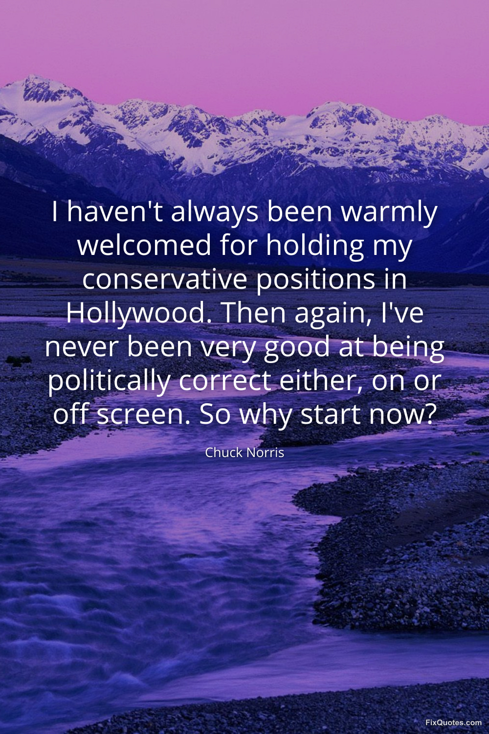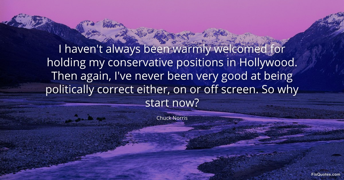 Norris, Chuck. (2026, March 20). I haven't always been warmly welcomed for holding my conservative positions in Hollywood. Then again, I've never been very good at being politically correct either, on or off screen. So why start now? FixQuotes. https://fixquotes.com/quotes/i-havent-always-been-warmly-welcomed-for-holding-186218/