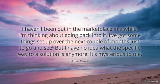 Nesmith, Michael. "I haven't been out in the marketplace in a while. I'm thinking about going back into it. I've got some things set up over the next couple of months just to go and see. But I have no idea what the specific way to a solution is anymore. It's mysterious to me." FixQuotes. January 16, 2026. https://fixquotes.com/quotes/i-havent-been-out-in-the-marketplace-in-a-while-105073/.