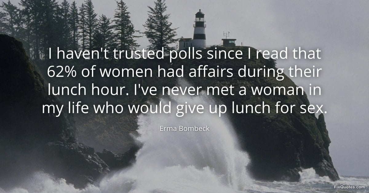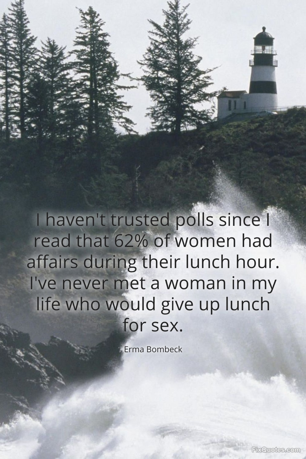 Bombeck, Erma. (2026, January 18). I haven't trusted polls since I read that 62% of women had affairs during their lunch hour. I've never met a woman in my life who would give up lunch for sex. FixQuotes. https://fixquotes.com/quotes/i-havent-trusted-polls-since-i-read-that-62-of-23552/