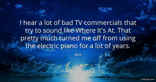 Beck. "I hear a lot of bad TV commercials that try to sound like Where It's At. That pretty much turned me off from using the electric piano for a lot of years." FixQuotes. January 17, 2026. https://fixquotes.com/quotes/i-hear-a-lot-of-bad-tv-commercials-that-try-to-40614/.