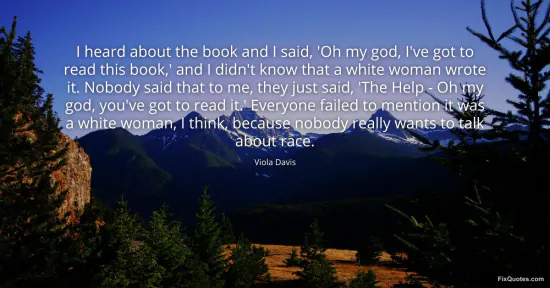 Davis, Viola. "I heard about the book and I said, 'Oh my god, I've got to read this book,' and I didn't know that a white woman wrote it. Nobody said that to me, they just said, 'The Help - Oh my god, you've got to read it.' Everyone failed to mention it was a white woman, I think, because nobody really wants to talk about race." FixQuotes. January 18, 2026. https://fixquotes.com/quotes/i-heard-about-the-book-and-i-said-oh-my-god-ive-21813/.