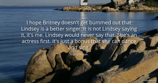 Madsen, Virginia. "I hope Britney doesn't get bummed out that Lindsey is a better singer. It is not Lindsey saying it, it's me. Lindsey would never say that. She's an actress first. It's just a bonus that she can dance and sing." FixQuotes. January 15, 2026. https://fixquotes.com/quotes/i-hope-britney-doesnt-get-bummed-out-that-lindsey-161733/.