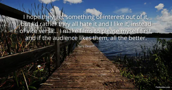 Zwigoff, Terry. "I hope they get something of interest out of it, but I'd rather they all hate it and I like it, instead of vice versa... I make films to please myself first, and if the audience likes them, all the better." FixQuotes. January 15, 2026. https://fixquotes.com/quotes/i-hope-they-get-something-of-interest-out-of-it-145288/.