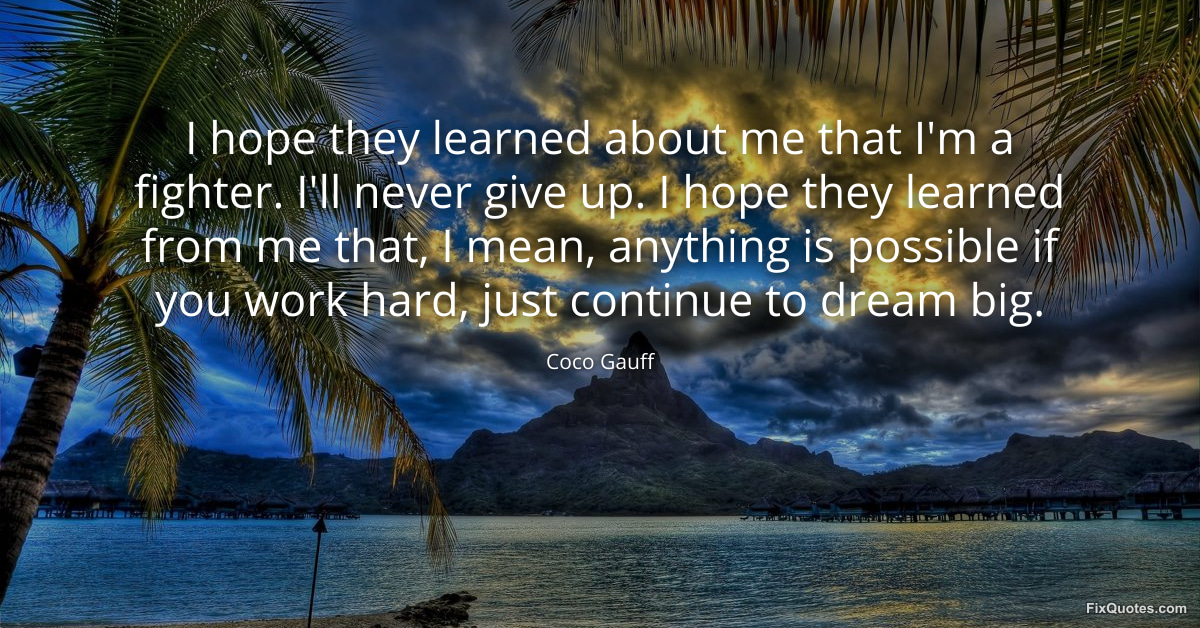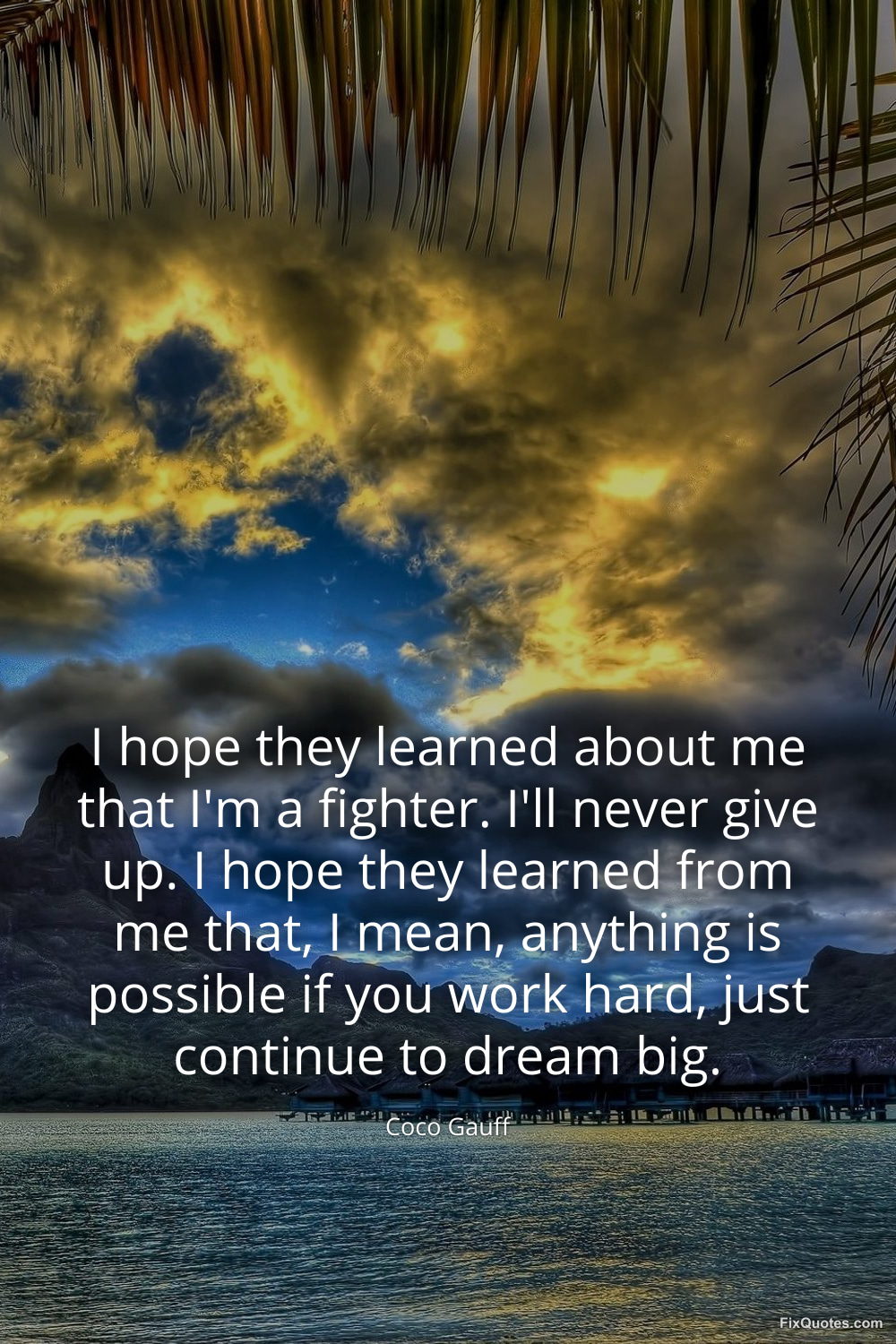 Gauff, Coco. (2026, March 17). I hope they learned about me that I'm a fighter. I'll never give up. I hope they learned from me that, I mean, anything is possible if you work hard, just continue to dream big. FixQuotes. https://fixquotes.com/quotes/i-hope-they-learned-about-me-that-im-a-fighter-186131/