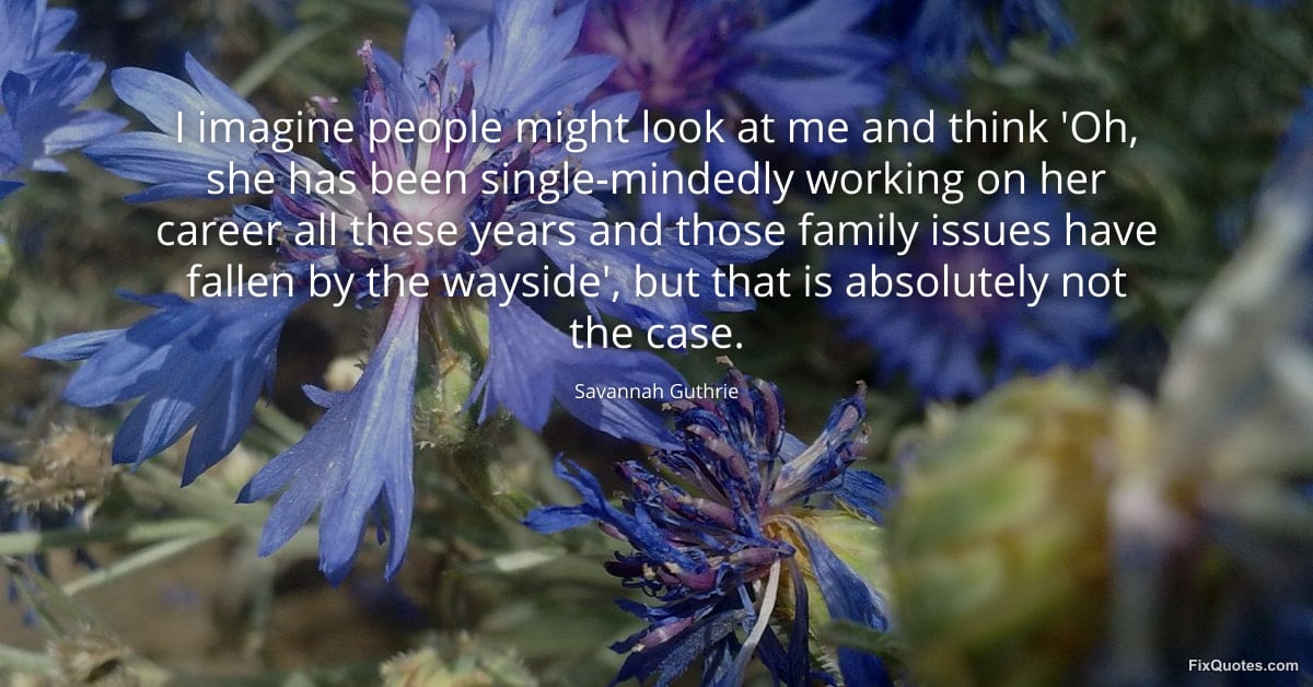 Guthrie, Savannah. "I imagine people might look at me and think 'Oh, she has been single-mindedly working on her career all these years and those family issues have fallen by the wayside', but that is absolutely not the case." FixQuotes. February 11, 2026. https://fixquotes.com/quotes/i-imagine-people-might-look-at-me-and-think-oh-185275/.