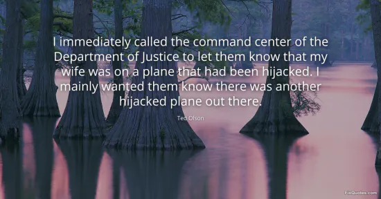 Olson, Ted. "I immediately called the command center of the Department of Justice to let them know that my wife was on a plane that had been hijacked. I mainly wanted them know there was another hijacked plane out there." FixQuotes. January 16, 2026. https://fixquotes.com/quotes/i-immediately-called-the-command-center-of-the-131070/.