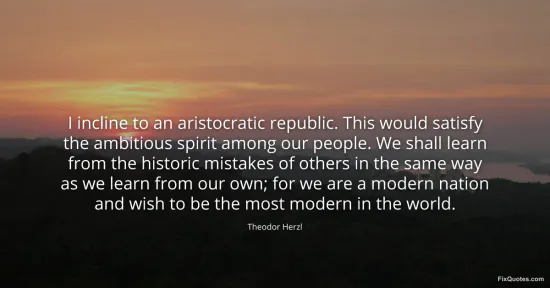 Herzl, Theodor. (2026, January 16). I incline to an aristocratic republic. This would satisfy the ambitious spirit among our people. We shall learn from the historic mistakes of others in the same way as we learn from our own; for we are a modern nation and wish to be the most modern in the world. FixQuotes. https://fixquotes.com/quotes/i-incline-to-an-aristocratic-republic-this-would-96665/