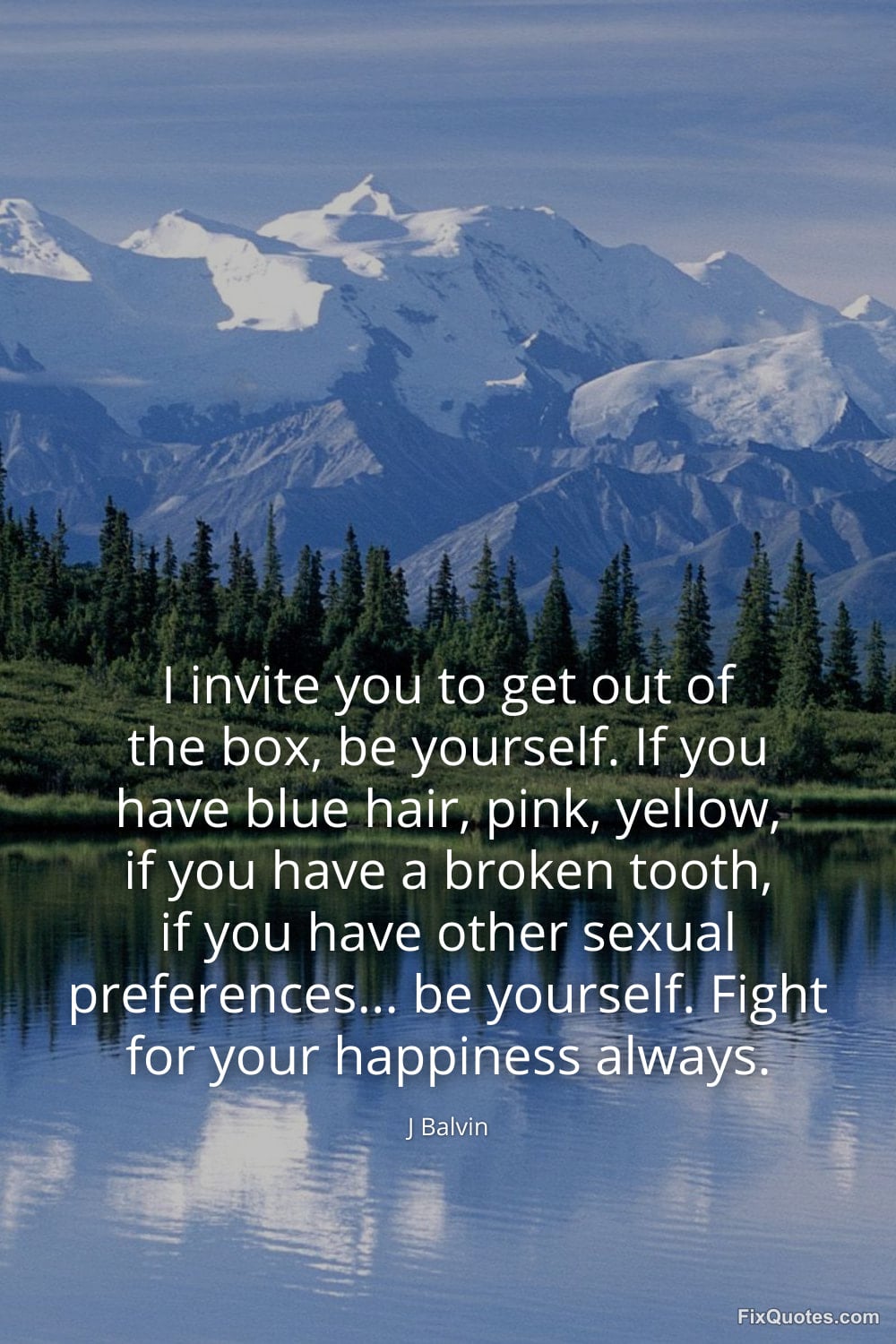 Balvin, J. "I invite you to get out of the box, be yourself. If you have blue hair, pink, yellow, if you have a broken tooth, if you have other sexual preferences... be yourself. Fight for your happiness always." FixQuotes. February 16, 2026. https://fixquotes.com/quotes/i-invite-you-to-get-out-of-the-box-be-yourself-if-184900/.