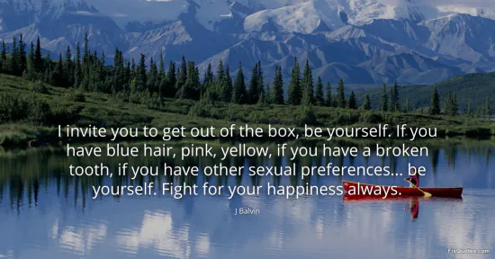 Balvin, J. (2026, February 16). I invite you to get out of the box, be yourself. If you have blue hair, pink, yellow, if you have a broken tooth, if you have other sexual preferences... be yourself. Fight for your happiness always. FixQuotes. https://fixquotes.com/quotes/i-invite-you-to-get-out-of-the-box-be-yourself-if-184900/