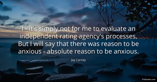 Carney, Jay. "I - it's simply not for me to evaluate an independent rating agency's processes. But I will say that there was reason to be anxious - absolute reason to be anxious." FixQuotes. January 15, 2026. https://fixquotes.com/quotes/i-its-simply-not-for-me-to-evaluate-an-143024/.