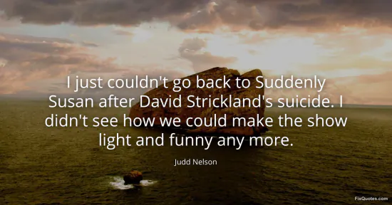 Nelson, Judd. "I just couldn't go back to Suddenly Susan after David Strickland's suicide. I didn't see how we could make the show light and funny any more." FixQuotes. January 15, 2026. https://fixquotes.com/quotes/i-just-couldnt-go-back-to-suddenly-susan-after-155198/.