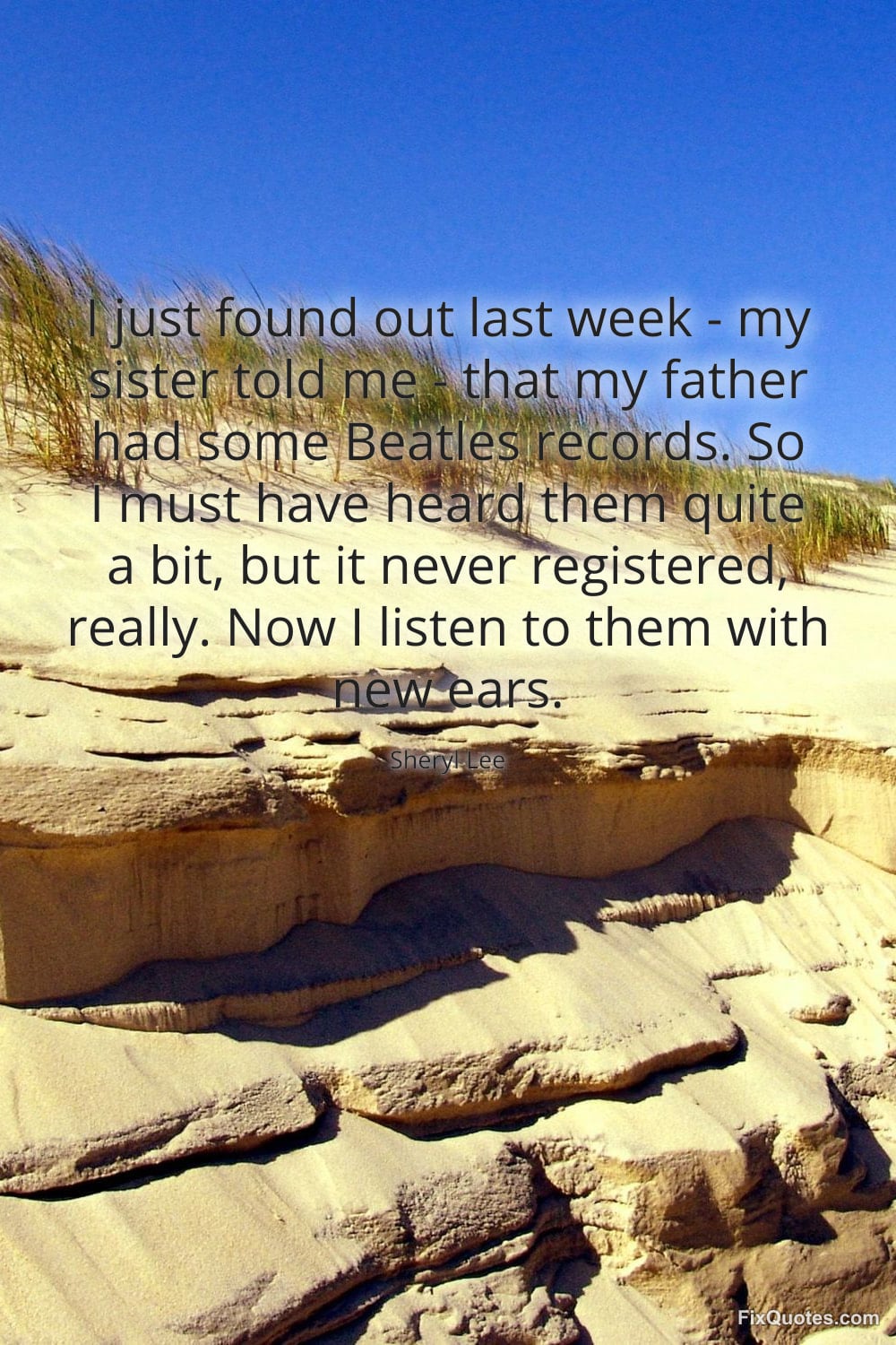 Lee, Sheryl. (2026, January 15). I just found out last week - my sister told me - that my father had some Beatles records. So I must have heard them quite a bit, but it never registered, really. Now I listen to them with new ears. FixQuotes. https://fixquotes.com/quotes/i-just-found-out-last-week-my-sister-told-me-165827/