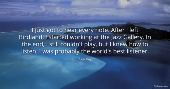 There is something deliciously subversive in a musician declaring herself "the world's best listener" right after admitting she "still couldn't play". Carla Bley flips the usual hero narrative of jazz - the lone genius shedding scales until the horn catches fire - into a quieter origin story: apprenticeship as immersion, not virtuosity. The line "I just got to hear every note" reads like awe, but also like method. Birdland isn't just a club here; it's an education system with no syllabus, where the tuition is attention and the curriculum is proximity.