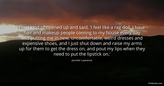 Lawrence, Jennifer. "I just kind of opened up and said, 'I feel like a rag doll. I have hair and makeup people coming to my house every day and putting me in new, uncomfortable, weird dresses and expensive shoes, and I just shut down and raise my arms up for them to get the dress on, and pout my lips when they need to put the lipstick on.'." FixQuotes. January 16, 2026. https://fixquotes.com/quotes/i-just-kind-of-opened-up-and-said-i-feel-like-a-110618/.