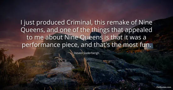 Soderbergh, Steven. "I just produced Criminal, this remake of Nine Queens, and one of the things that appealed to me about Nine Queens is that it was a performance piece, and that's the most fun." FixQuotes. January 15, 2026. https://fixquotes.com/quotes/i-just-produced-criminal-this-remake-of-nine-159959/.