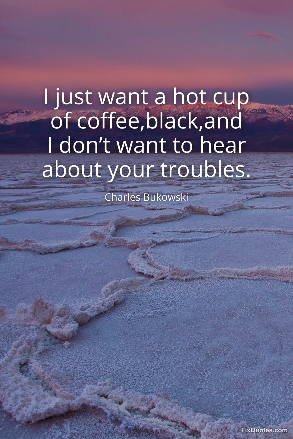 Bukowski, Charles. "I just want a hot cup of coffee,black,and I don’t want to hear about your troubles." FixQuotes. February 10, 2026. https://fixquotes.com/quotes/i-just-want-a-hot-cup-of-coffeeblackand-i-dont-185194/.