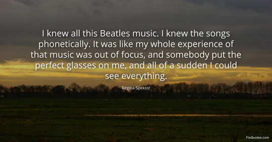 Spektor, Regina. "I knew all this Beatles music. I knew the songs phonetically. It was like my whole experience of that music was out of focus, and somebody put the perfect glasses on me, and all of a sudden I could see everything." FixQuotes. January 16, 2026. https://fixquotes.com/quotes/i-knew-all-this-beatles-music-i-knew-the-songs-128914/.