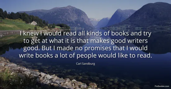 Sandburg, Carl. "I knew I would read all kinds of books and try to get at what it is that makes good writers good. But I made no promises that I would write books a lot of people would like to read." FixQuotes. January 15, 2026. https://fixquotes.com/quotes/i-knew-i-would-read-all-kinds-of-books-and-try-to-145601/.