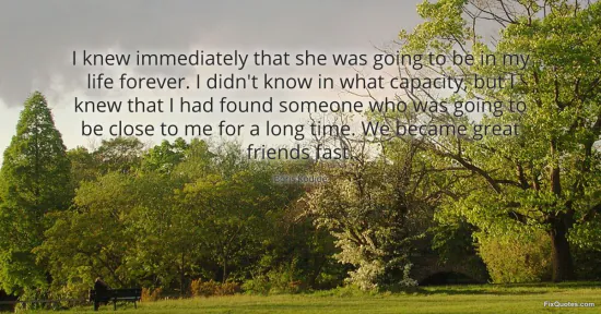 "I knew immediately that she was going to be in my life forever. I didn't know in what capacity, but I knew that I had found someone who was going to be close to me for a long time. We became great friends fast." FixQuotes, 18 Jan. 2026, https://fixquotes.com/quotes/i-knew-immediately-that-she-was-going-to-be-in-my-4272/. Accessed 18 Feb. 2026.