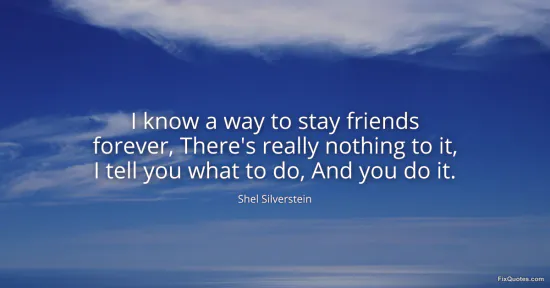 Silverstein, Shel. (2026, January 16). I know a way to stay friends forever, There's really nothing to it, I tell you what to do, And you do it. FixQuotes. https://fixquotes.com/quotes/i-know-a-way-to-stay-friends-forever-theres-130984/